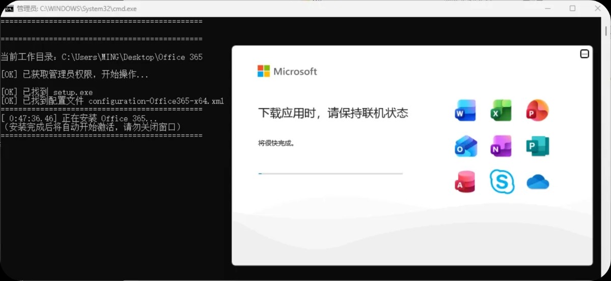 按照屏幕提示,等待进度条走完。此过程会自动下载并安装 Office 组件。