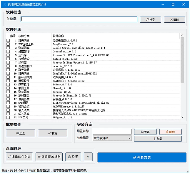 软件静默批量安装管理工具一个用于批量、静默安装本地软件的管理程序。 支持并行安装、智能参数检测以及强制规则覆盖,可实现一键自动化部署进行软件安装。